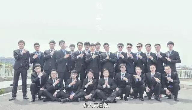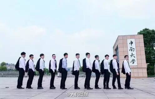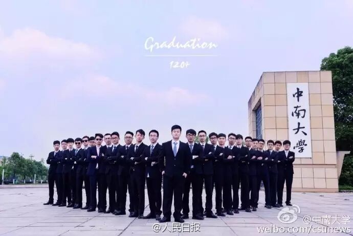 昨天,@中南大学 发出一组新鲜出炉的“最阳刚毕业照”。照片里是该学校资生院矿物1204班的同学,和其它班级不同,清一色都是男生!他们身着正装,摆出或霸气或清新的pose。“大学四年,最宝贵的就是这份兄弟情谊。”