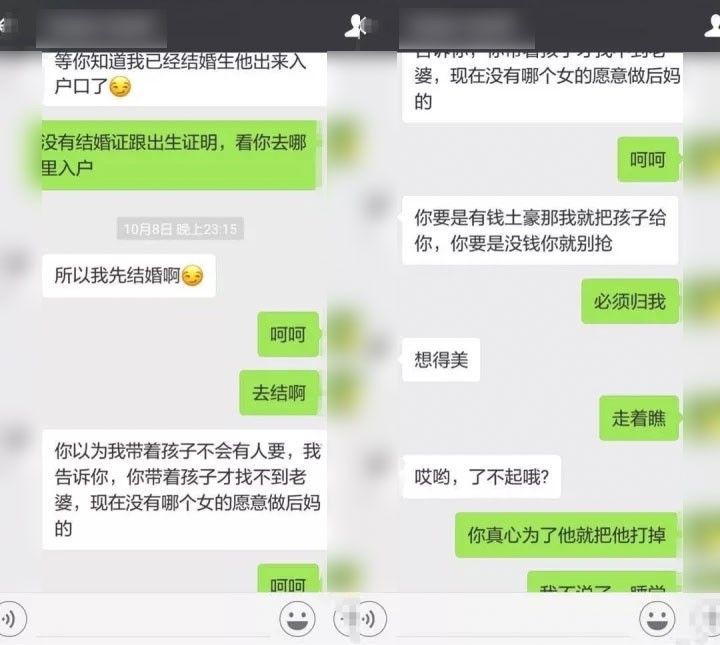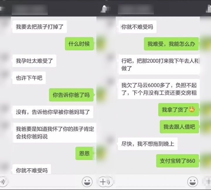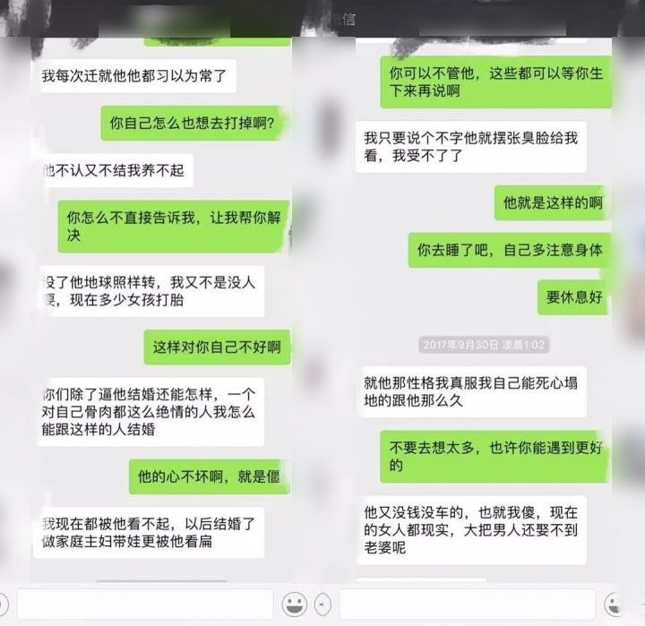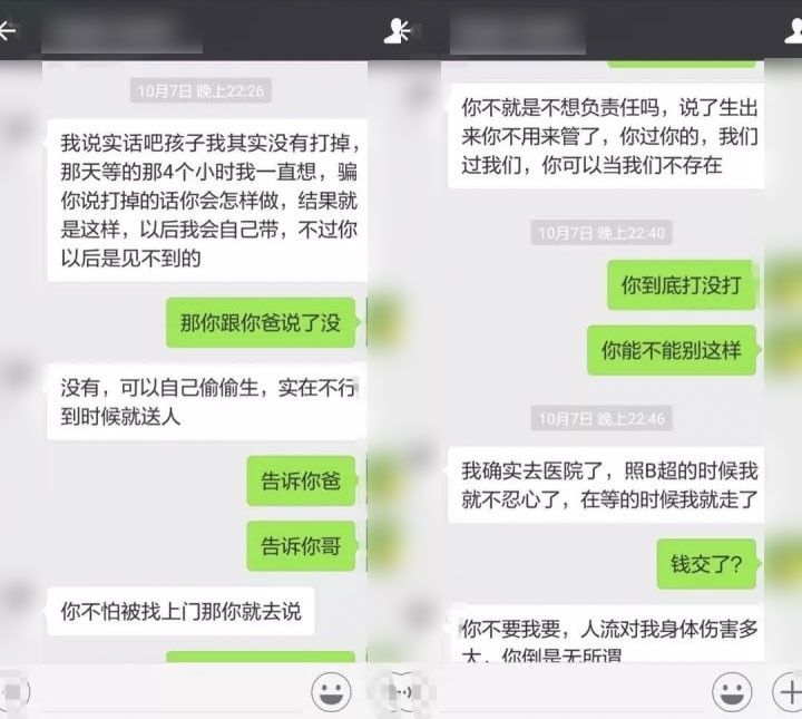 没想到,在9月27日,女主到了广州又来和我说怀孕了。在第一时间我是想和她结婚并生下孩子的,并且答应她让我妈妈过来照顾她。他一直不肯结婚。这个时候我已经被他折磨得神经错乱,既然她不肯结婚,又不肯生孩子,那就让她去打掉,于是就有了你们看到的对话,是我让女主去打胎的。但是!!对话中她做了部分删减,看起来她是很无助的一方,实际上她表示她会先找个人结婚,把孩子生出来,不给我认!以下我将对话复原!