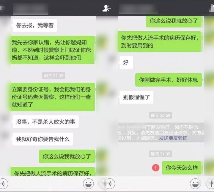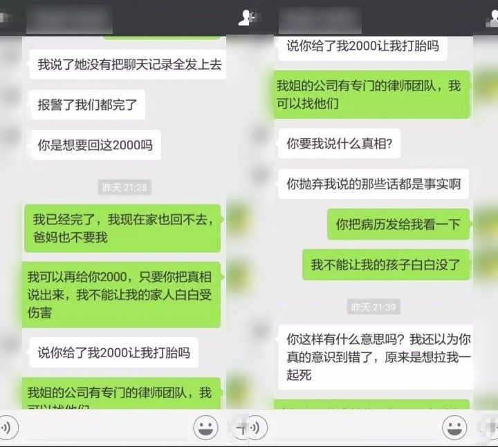 女主两次和我说她已经去了医院做人流,第一次是你们在公众号看到的,她去医院后心软了,没做。第二次是公众号发文后我联系她,她告诉我已经把孩子做了人流。在此前她并没有为我流产过一次,那是因为公众号聊天记录排版的问题,引起的误会,我没有让她流产过一次。里面那句:“你之前流产你父母知道吗?”实际上是指她第一次骗我说做了人流的那个时候。聊天记录中还有一句“自己做好结婚后的生活准备”,这句话意思并非要在婚后虐待她,而是提醒她婚后没钱可以给她过上好日子,要有心理准备。由于图片实在太多,我就不放图了,女主爆料的图里面有。