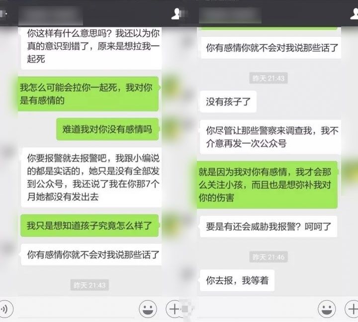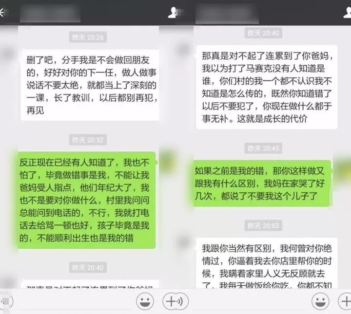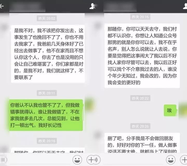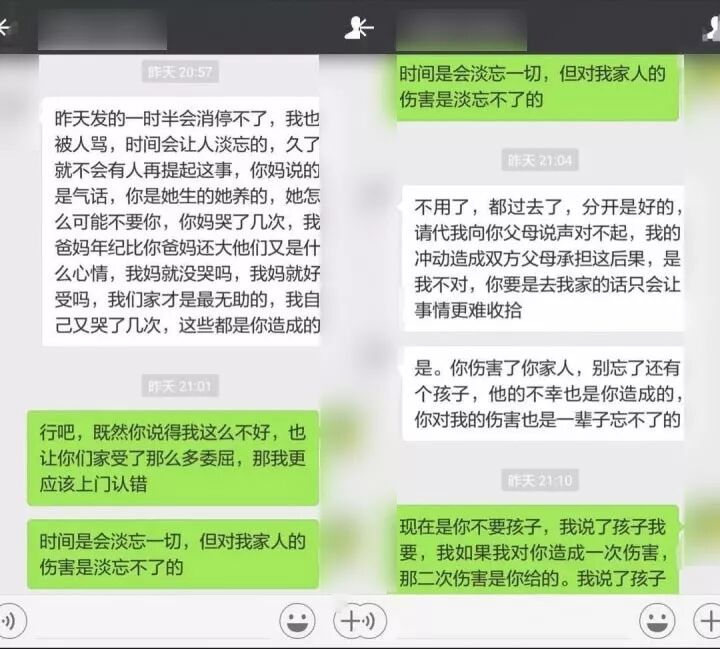 我的父母已年过半百,他们是善良安分的人,我不能让他们再因为我的事情受到影响,辛苦抚养我长大,不能因为我一人不成熟做出的混账事就埋没了他们对我的养育之恩。而给旁人觉得做错事的是他们。因为从始至终都是我自己做了错事,父母也及时的训导我要敢于承担自己犯下的错误,去尽力的去弥补,而不是一味的放任不管。人谁无过,重要的是最后做出了什么样的改变,我的改变相信大家看了上面的对话都有目共睹了。但是我亦为人子女,亲情和爱情一样很重要,所以在我为爱情尽责的时候,也要为亲人尽责,在我理清整件事情的来龙去脉后,女主也消失联系不上后,我深思熟虑后决定报警,请大家相信我并不是想把事情白日化,只是想第一次作成年人后的自己认真负责的去处理这件事情。还想说一句的是,可怜天下父母心,我的家人在听到我的决定后,确是想要阻止我,他们说,大事化小就好,毕竟对方是女孩子,不像你,你是男人,脸皮很薄,不好闹大,对方的父母也是会心疼的。以上,也许这就是我的家庭教育的氛围,也是我后来大转变的原因,我要那个孩子。愿意与女主一起组建家庭。并为之付出努力。