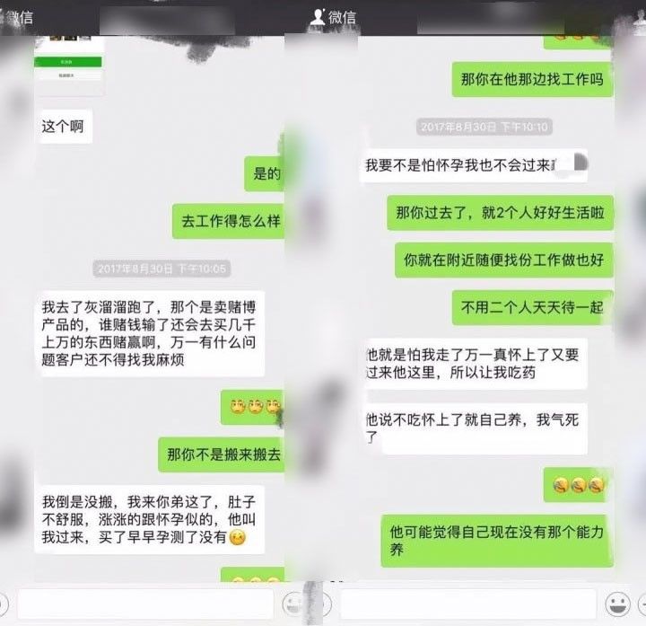 没想到!!回到店里之后她和我说其实没怀孕!! 以下为她和我姐姐聊天记录截图。8月28日回到我店里,和我姐姐聊天记录在8月30日!