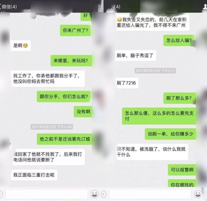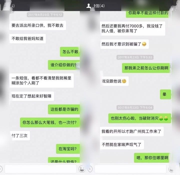 谁知回家第二天,她就告诉我她被骗了7000元,收到短信加了一个人做刷单,这个刷单之后没有返现。她参与这个刷单也没有告诉我,在我店里这几个月她没有出去工作,我也不知道她哪来的钱!!!随后她还找我的朋友借钱,我的朋友没有借给她。以下为女主与我姐姐聊天截图为证!!
