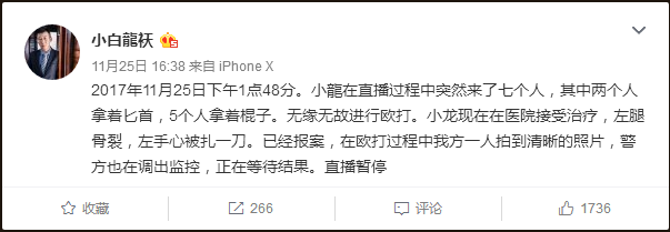 昨天下午发生了一件非常令人发指的事情,小白龙户外正在直播,忽来一群不明之人,对着小白龙就是拳打脚踢,甚至动用了刀子,小白龙无缘无故被打,导致左腿骨裂,左手心被刀扎了,小白龙现正在医院接受治疗,目前已经报警,案件正在调查之中。