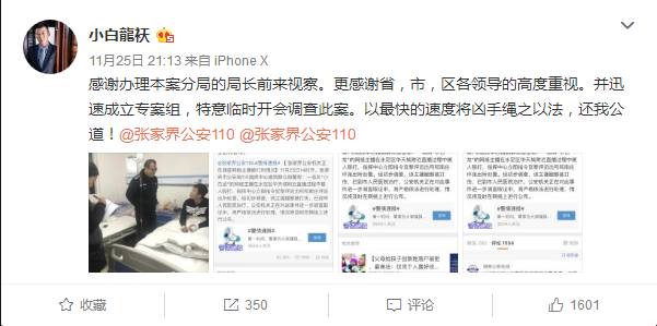 随后小白龙发微博:感谢办理本案分局的局长前来视察。更感谢省,市,区各领导的高度重视。并迅速成立专案组,特意临时开会调查此案。以最快的速度将凶手绳之以法,还我公道!
