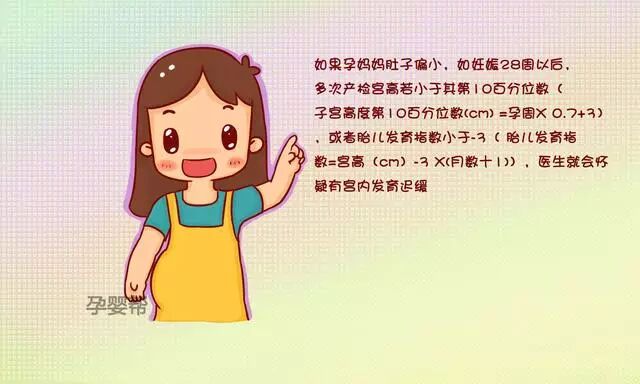 如果孕妈妈肚子偏小,如妊娠28周以后,多次产检宫高若小于其第10百分位数(子宫高度第10百分位数(cm) =孕周X 0.7+3),或者胎儿发育指数小于-3( 胎儿发育指数=宫高(cm)-3 X(月数十1)),医生就会怀疑有宫内发育迟缓。