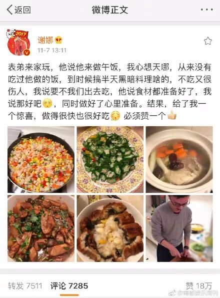 就在昨天中午,孕妈谢娜晒出一组照片,发文称表弟来家里给自己做饭。照片中可以看到表弟颜值颇高,做的饭菜也色香味俱全,看起来十分诱人,娜姐心情也非常的好。还不忘给小表弟相亲。