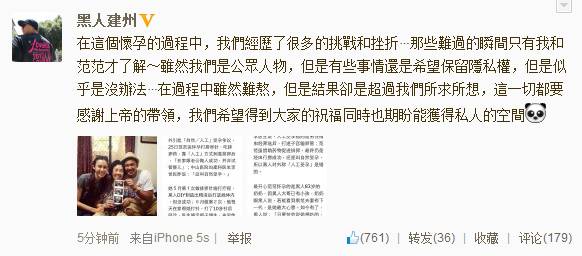 她通过微博晒孕照,发表长微博细数怀孕心路历程。曾经医生似乎给她“判了死刑”,称她怀孕率非常低。但是她依然四处求医问药,然而各种药物反应使得她水肿,忽胖忽瘦,甚至一度昏厥。