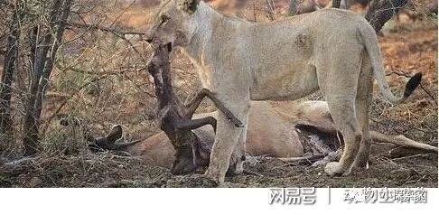 原来这只母狮看到这只羚羊已经怀孕了,于是它就把,羚羊肚中的小羚羊叼了出来。可以看到这只小羚羊居然是活着的,真是太神奇了。