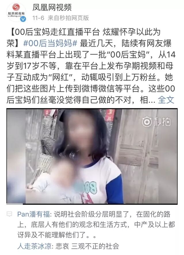 有网友爆料某直播平台上出现了一批“00后宝妈”,从14岁到17岁不等,大多是念初中时怀孕辍学,靠在平台上发布孕期视频和母子互动成为“网红”,动辄吸引到上万粉丝。她们把这些图片、视频上传到微博微信等平台。