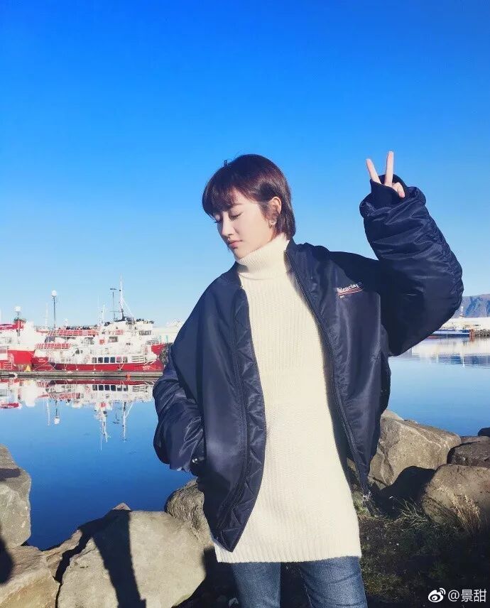额头好看的景甜把刘海扎起来,俏皮可爱。短发如果走中性风,简单出街穿男朋友外套出门就可以了。