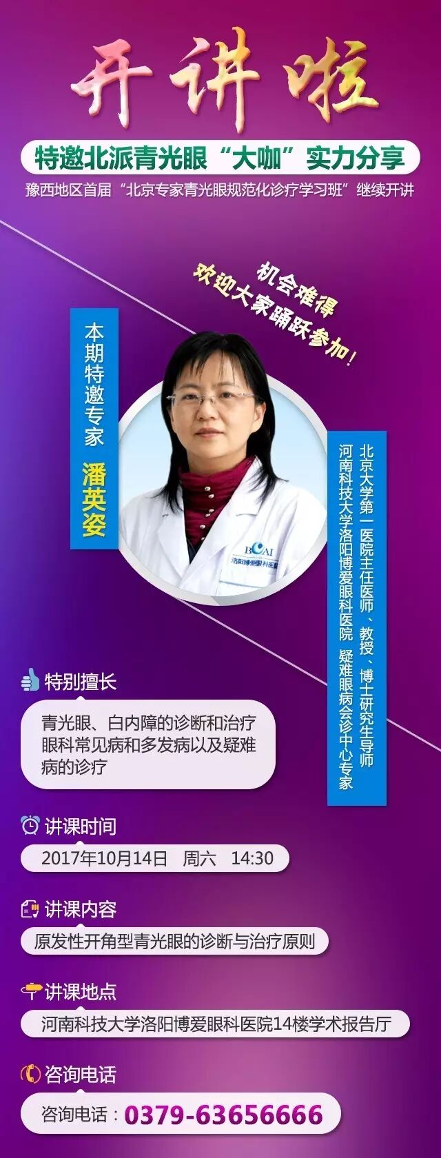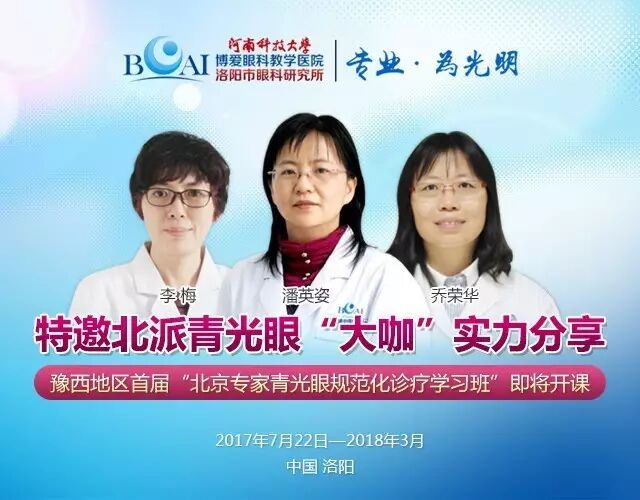 从2017年7月22日开始到2018年3月,我院将力邀北京大学第一医院眼科潘英姿教授、北京大学第一医院眼科李梅教授、清华大学附属北京清华长庚医院眼科乔荣华教授分别莅临授课,三位教授均师从我国北派青光眼学术代表人李美玉教授,在青光眼专业耕耘数十载,在临床和学术上成绩斐然。此次能应邀到洛阳授课,对临床医生和患者都是一大幸事。本次学习班将为豫西地区青光眼专业注入新鲜的血液,使豫西地区的眼科医生在家门口就能接受到来自北京权威青光眼专家的授课,学习到最新的理念和方法,也将推动豫西地区青光眼临床学科的发展,让更多青光眼患者接受规范化诊疗。