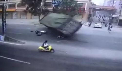 【社会】实拍拉煤大车侧翻埋压骑车人 后座女孩瞬间跑出