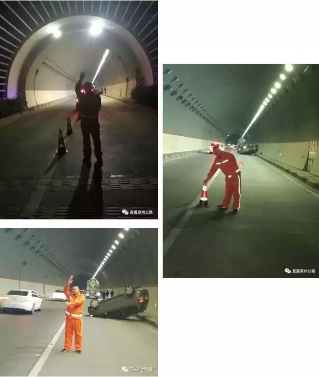泉州市公路局直属分局朋山岭隧道管理站的工作人员在现场疏导交通协助救援,请过往车辆减速慢行,注意避让。(图片:朋山岭隧道管理站)