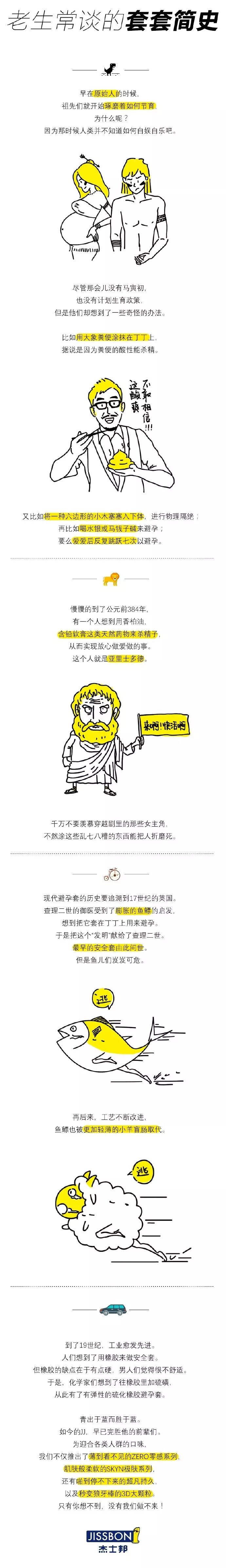 既然是避孕日,老司机自然不会只是发一张海报就完事儿了,于是安全套就讲了讲他的历史——杜蕾斯《避孕简史》和杰士邦《套套简史》。