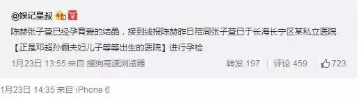 在1月23日,据微博认证为娱记皇叔的网友就已经在微博爆料称“陈赫张子萱已经孕育爱的结晶,接到线报陈赫昨日陪同张子萱已于长海长宁区某私立医院,正是邓超孙俪夫妇儿子等等出生的医院进行孕检。”