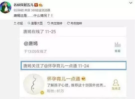 除此之外,资深八卦媒体人名侦探赵五儿还发现就在11月底,唐嫣的新浪微博突然关注了@怀孕育儿一点通,这个行为的确有点端倪。