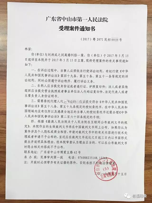 林苗还晒出了与刘洲成离婚纠纷的手里案件通知书以及家暴史相关证据。