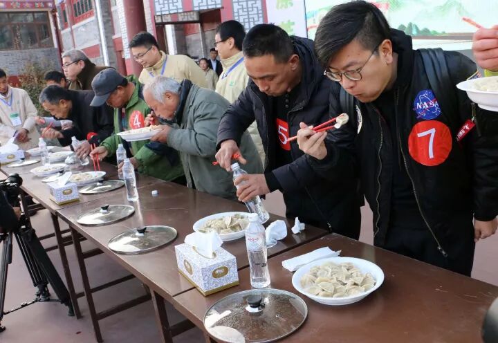2017年12月9日,山东省潍坊市,市民正在参加“大胃王吃水饺”比赛。当日,一场别开生面的“大胃王吃水饺”比赛在山东省潍坊市十笏园文化街区举行,24名市民报名参加比赛,在一分钟时间内吃40个水饺看谁吃的最快,现场参赛的市民面对一盘盘的水饺你争我赶,吸引了众人的目光。