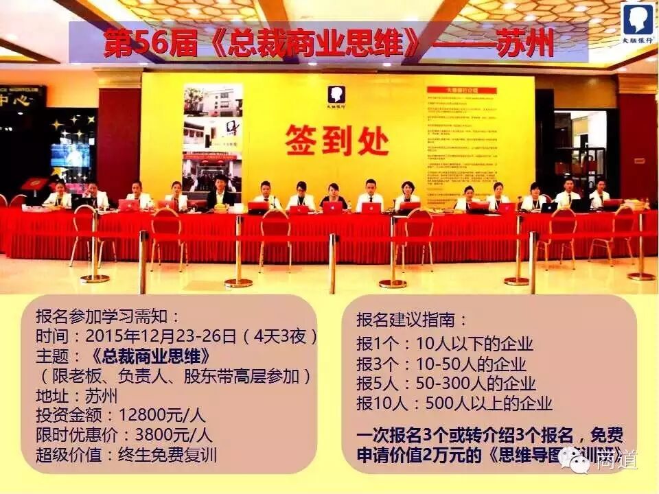 2、 转介绍3位朋友报名参加《总裁商业思维》课程,可以免费申请价值2万元的《思维导图培训班》名额一个;