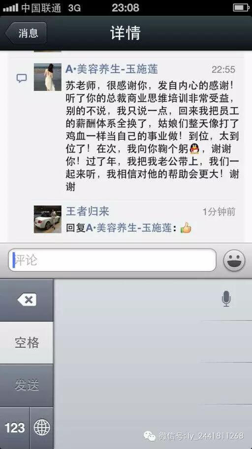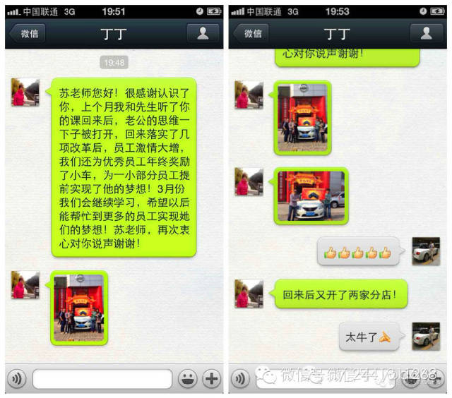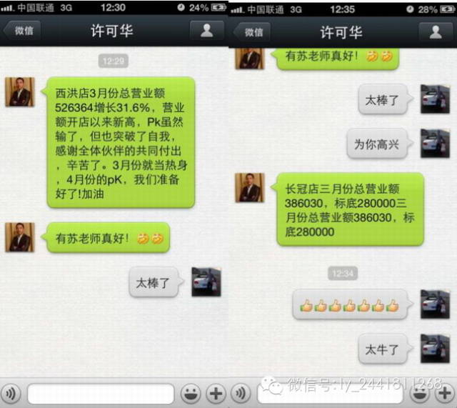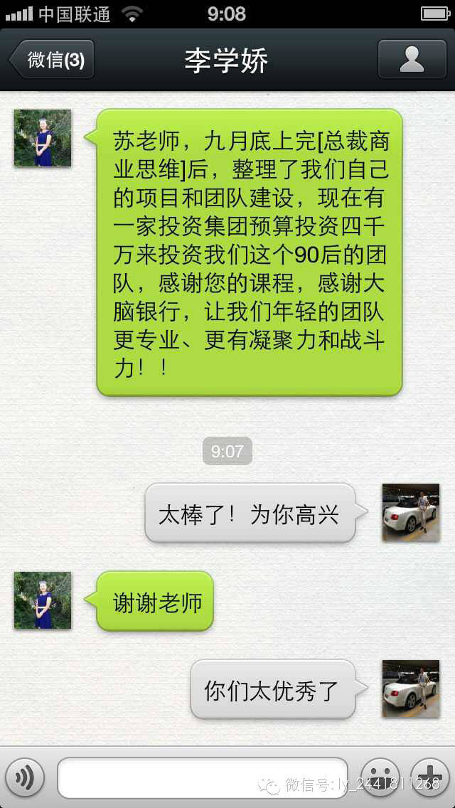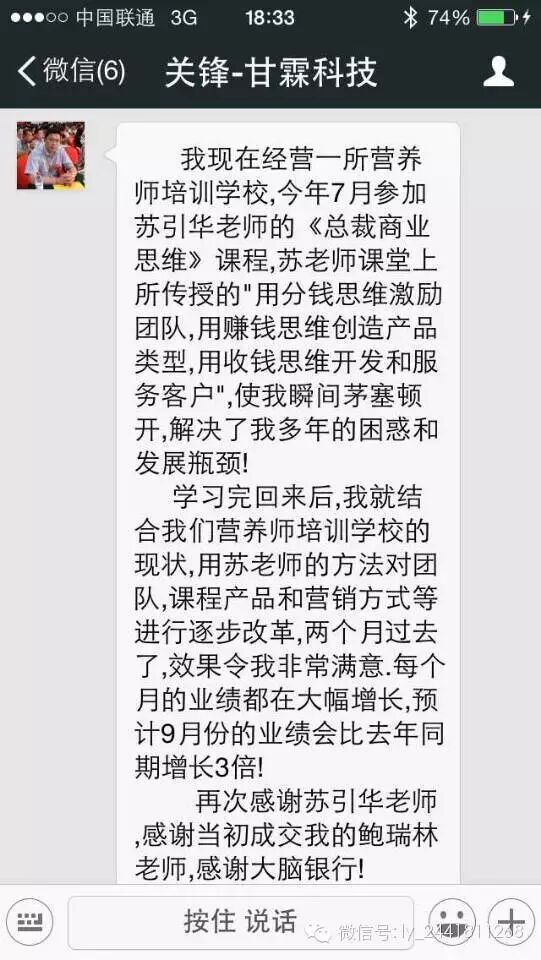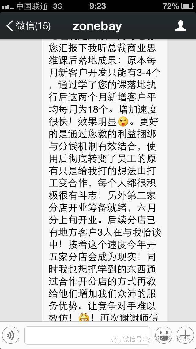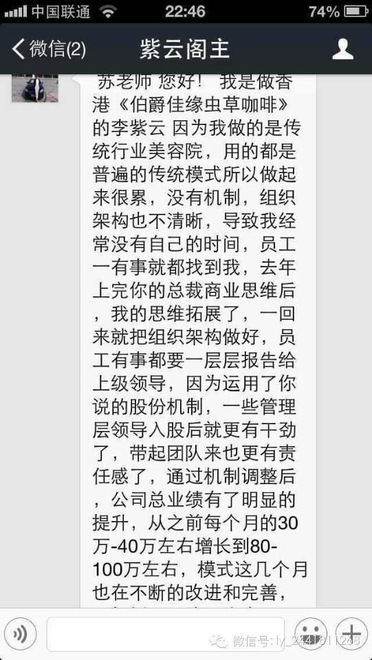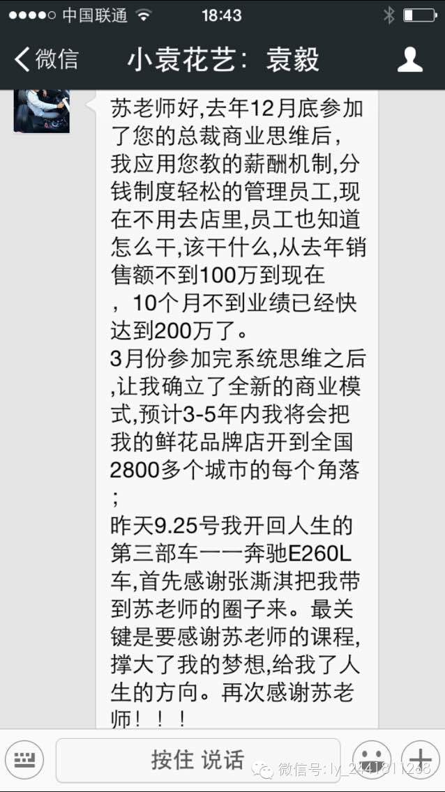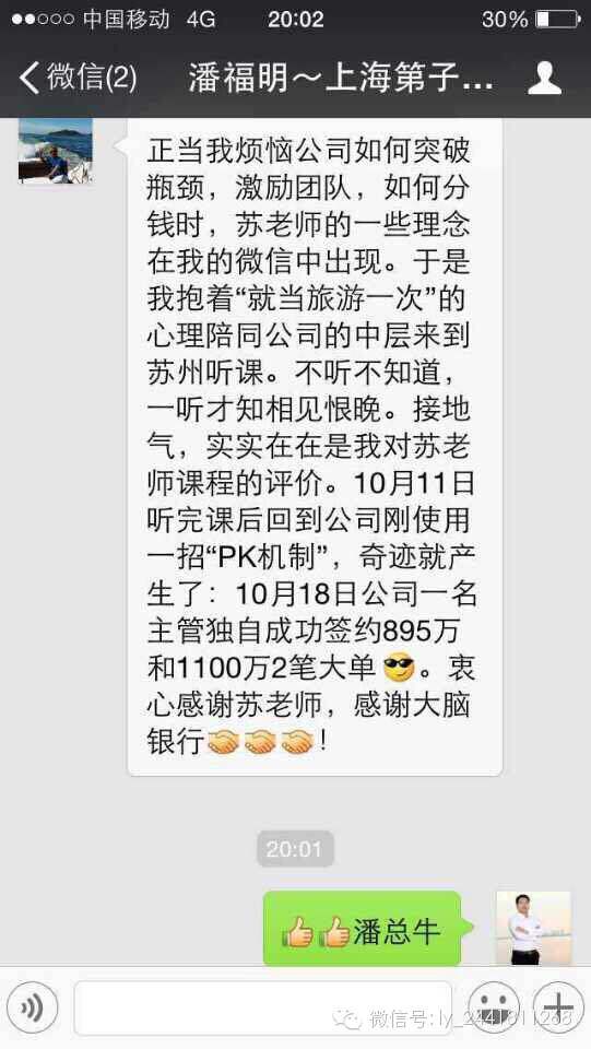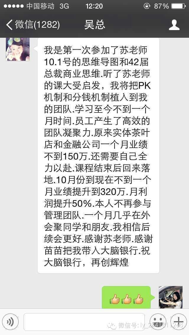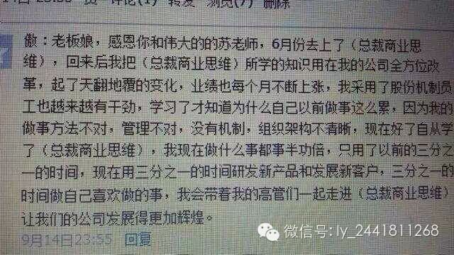 做实体茶叶店和金融的吴总之前一个月两个公司的业绩还不到150万,10月份第一次参加苏引华老师的《总裁商业思维》课程,将所学“PK机制”和“分钱机制”导入团队,不到一个月时间业绩提升到320万,月利润提升了50%,本人不再参与团队管理,每月只是在外和朋友聚聚会,聊聊天,感谢苏老师!来自山西的罗总昨天学习总裁商业思维的收获:我的店业绩倍增也是因为间接用了苏老师的PK机制!PK用的好可以整疯整个团队!合理的工资机制加完善的PK机制在加核心团队的前期全力配合会快速成就一个超级有战斗力、生命力和凝聚力的团队!而不是团伙!我受益我拥护 课程的副作用就是让人睡不着!虽然明知道该睡了。