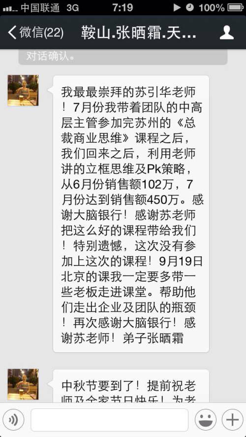 来自鞍山张晒霜张总7月份我带着团队的中高层主管参加完《总裁商业思维》课程之后,我们回来之后,利用老师讲的立框思维及Pk策略,从6月份销售额102万,7月份达到销售额450万。感谢苏老师把这么好的课程带给我们!