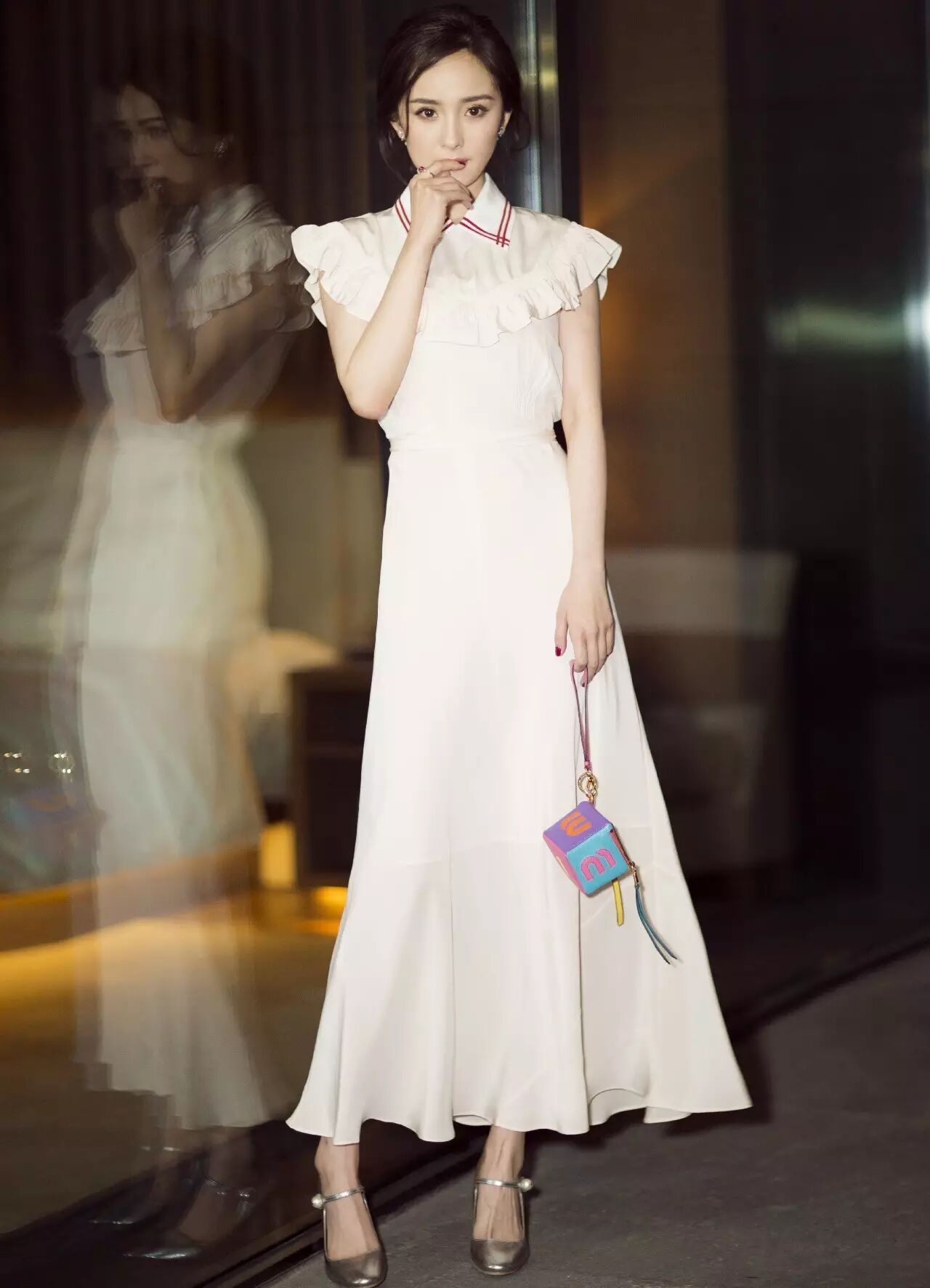 身着Miu Miu 2017早秋系列白色长裙出席在北京举办的Miu Miu海滩俱乐部,拼色小手提包的搭配给整套造型增色不少。