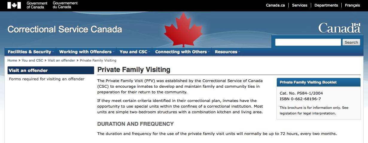 加拿大惩教署(Correctional Service Canada)鼓励犯人建立及维持家庭关系。符合条件的犯人,可以使用监狱内的特殊套间,这些套间包括双卧室、厨房还有客厅。“私人家庭探访”(Private Family Visiting)规定允许犯人使用套间的时间为72小时,每两个月最多可以使用一次。