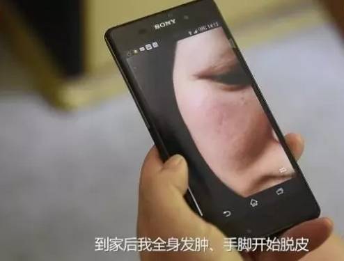照片显示,吴丽的身体多处出现红肿,手和脚也开始大面积蜕皮。“我很担心自己怀孕了,不敢用药,请假在家里,每天都很压抑。”吴丽说。