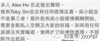 “本人Alex ho在此发出声明,我和Toby sin并没有任何感情瓜葛,吴若希并不是第三者。基于我和吴若希的感情刚刚开始,需要多点私人空间和大家的祝福,如再有任何诽谤及失实报道,会将此交给律师处理。”