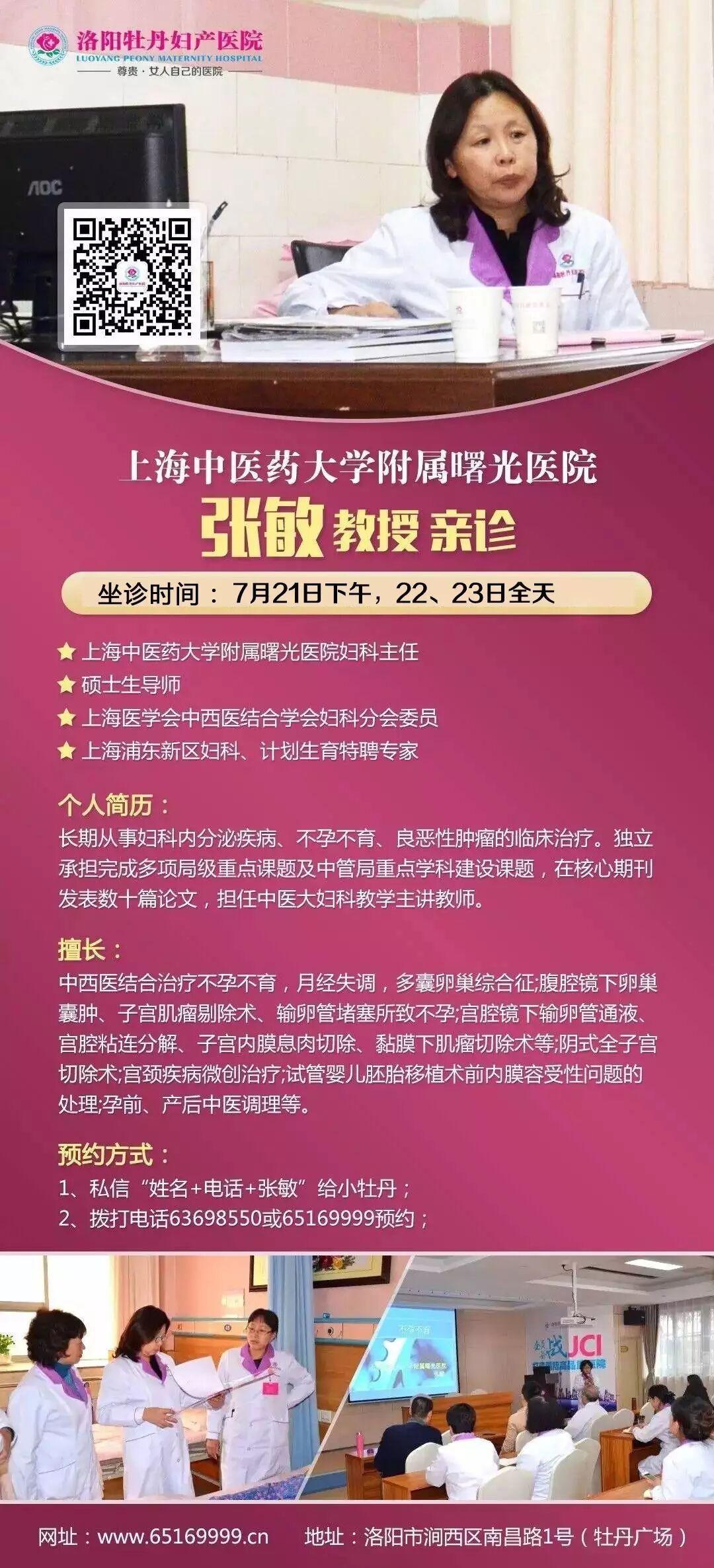 为了帮助广大患者早日摆脱不孕不育困扰,本周六周日特邀上海中医药大学附属曙光医院张敏教授来洛阳牡丹妇产医院坐诊,欢迎有需求的客户前来预约就诊。