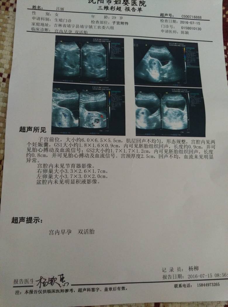 14天回医院验血,我自己去的老公上班没时间,当时很紧张,等结果等两个小时,结果出来,一看hcg406.9,知道怀孕了,激动的手抖,找主治大夫开药,继续打针吃药,在等14天验胎心胎芽,结果我是7月6号回医院,我的大夫开会,回不来,没办法,只能改成7月11号去,自己在家不放心,去医院看了一下,确定了一下宫内!这期间心里各种矛盾,怕没有胎心胎芽,怕失去宝宝!去医院做阴彩,大夫说两个,都有胎心胎芽了,都挺好的,放心吧,这回心里的石头落地了,6再等几天可以做了小三维,看看宝宝多大,我这才放心,。
