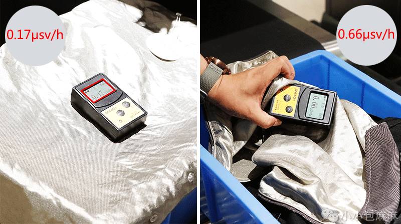 这是我们在某东上买的爆款大品牌防辐射服,看看它到底能不能防电离辐射中的射线辐射?当安检设备没有打开时,辐射值只有0.18。当衣物开始通过安检设备时,很抱歉,除了仪器刺耳的警报声和飙升的辐射数值我什么也没看到,看来是不防了!