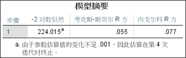 模型摘要表中输出但钱模型的-2log(似然值)和两个R方值,Cox&SnellR2和Nagelkerke R方,它们都表示了当前模型的质量,与线性回归模型的R方值不同,Logistic回归的决定系数都不会很大。从结果看,两个R方值都小于0.1,说明模型质量很差。