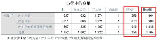 我们选取的三个变量为产妇年龄,产妇体重和产妇怀孕期间是否吸烟,其中产妇年龄的比分检验显著性为0.121,大于0.05,说明该自变量的回归系数与0没有显著性差异,换句话说也就是对是否生出低出生重量孩子没有显著性影响。由于本文中还没有介绍自变量的筛选,所以该结果不影响自变量进入模型。