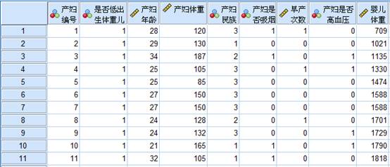 按照这份数据中新生儿的体重,以2500克为界限,将新生儿分为正常体重儿和低出生体重儿。按照分析兴趣和方便结果解释的需要,我们选取母亲年龄、母亲体重和是否吸烟三个自变量与是否低出生体重儿因变量进行二元Logistic回归,观察那些自变量会影响新生儿的体重情况。下图是收集到的新生儿母亲及其孩子的数据: