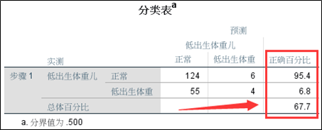 判断Logistic回归模型质量主要还是看验证分类表,从下表可以看到,该模型总的预测准确率为67.7,其中正常孩子的预测准确率达到95.4;低出生体重儿的预测准确性仅为6.8%,是非常低的概率,同样说明了模型的质量很差。