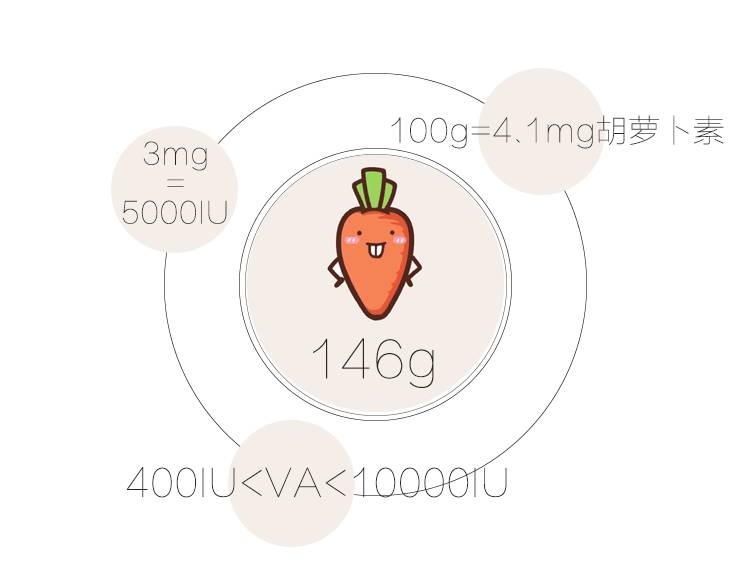 根据维生素A摄入量(每天不小于400IU,不多于10000 IU)的推荐,而 3mg的β胡萝卜素相当于5000IU,我们可以换算出β-胡萝卜素每天摄入量不要多于6mg,而100g的胡萝卜含有4.1mg胡萝卜素,也就是说每天胡萝卜摄入量大约在146g。
