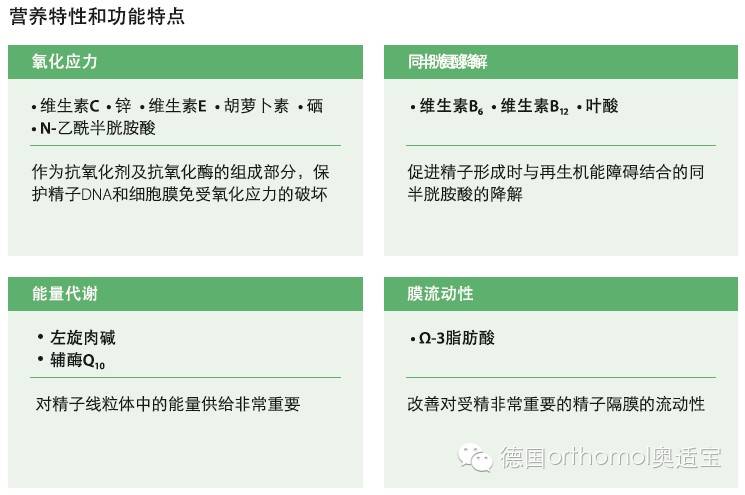 · 铜,硒,维生素C,维生素E和锌 有助于保护细胞免受氧化, 使自由基中性化. 在治疗男性生育力障碍时抗氧化剂的疗效令人信服, 免受氧化应力破坏的包括:精子隔膜和精子DNA. 抗氧化剂显著的积极影响, 3 个月后改善精子密度; 6 个月后提高精子能动性; 提升受孕率