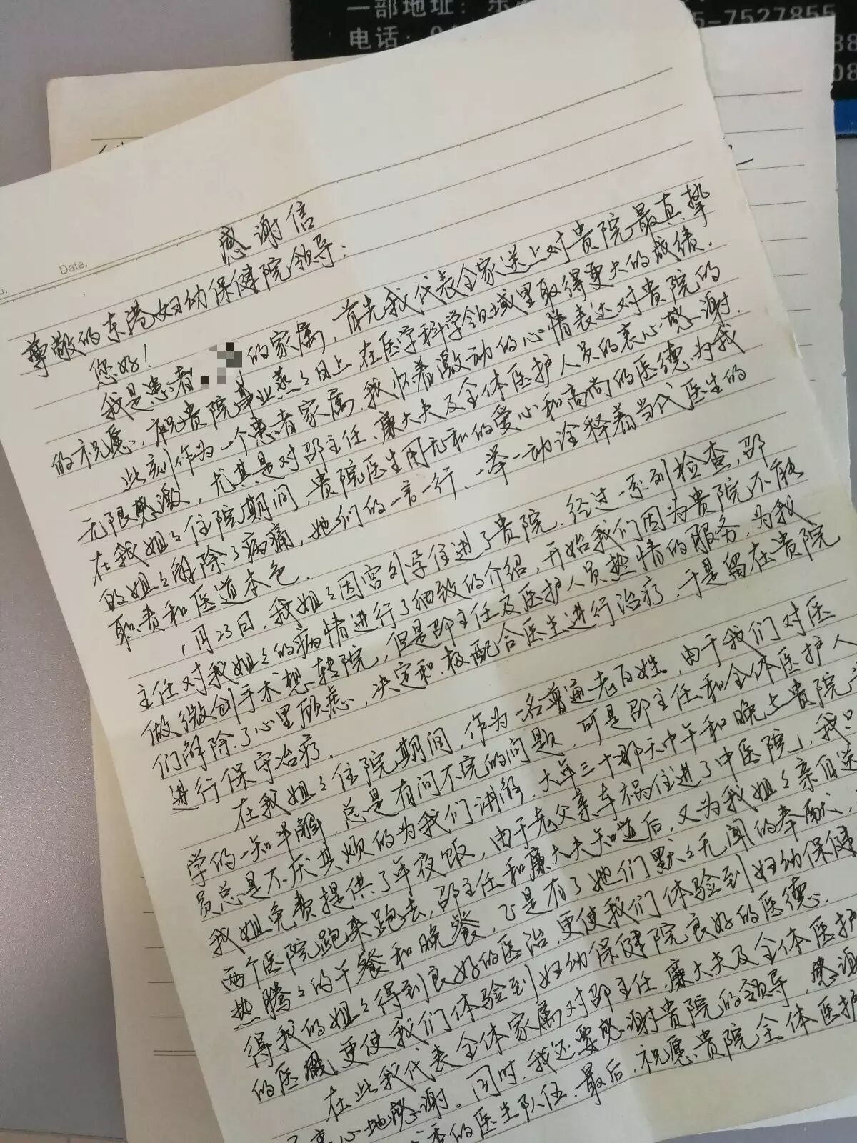 患者家属的感谢信是对我院医护人员工作的肯定,同时也是鞭策鼓舞。新的一年,我院将继续发扬“专于妇幼、精于保健、优于服务、诚于守信”的服务宗旨,树立榜样,创先争优,为广大妇女儿童的身体健康贡献力量。