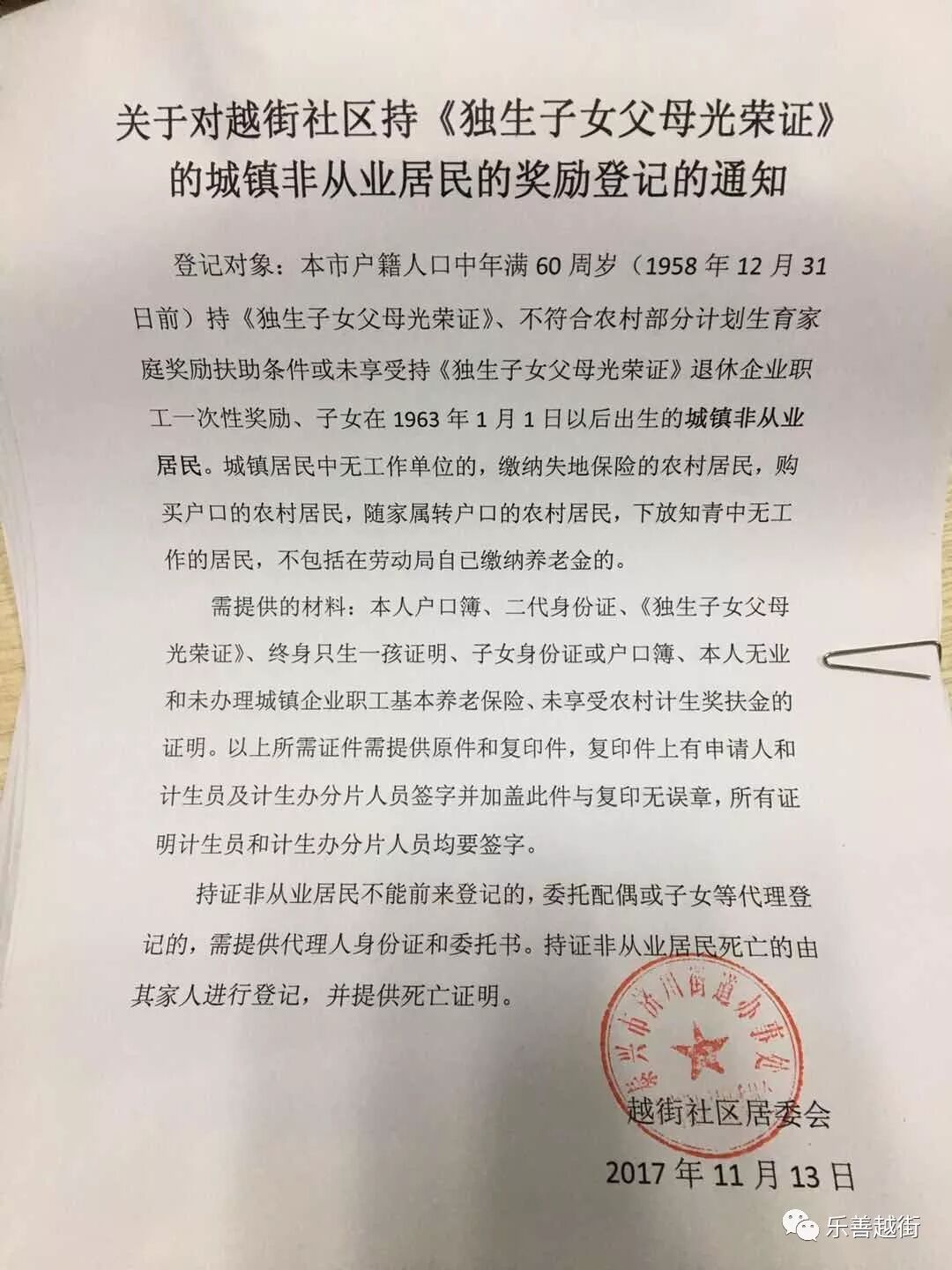 关于对越街社区持《独生子女父母光荣证》的城镇非从业居民的奖励登记的通知