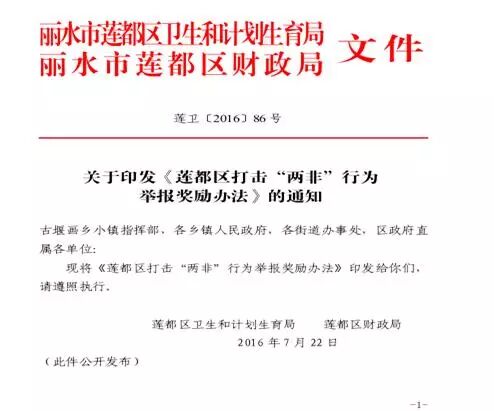 丽水市莲都区专门制订公布“两非”案件有奖举报文件,对提供“两非”线索属实,给予高额的奖励,最高一例奖励3万元。完善和落实相关管理制度,大力宣传“两非”违法观念,营造整治“两非”的浓厚舆论氛围,健全和巩固综合治理出生人口性别比偏高问题工作长效机制。