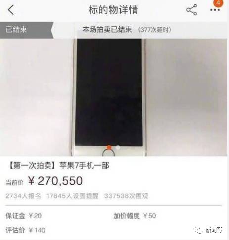 7日,南京秦淮区法院司法拍卖一部二手苹果7手机,最终以270550元成交。法院查实,车某某竞价2次,拍得手机。刘某某竞价124次。车某某自称“误看价格”,刘某某称是“开玩笑”。最终车某某拒绝按拍卖价付款,俩人的行为属于恶意拍卖,因此法院对车某某处1万元罚款,对刘某某处2万元罚款。