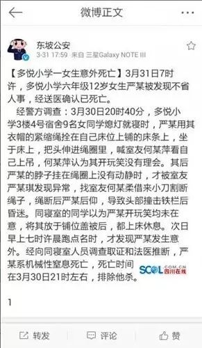 3月30日晚,眉山市某小学6年级女生严某,用紧缩绳拴在自己床位上铺的床条上,把头伸进绳圈里,喊室友看自己上吊,室友认为其开玩笑没理会,见严某没动静后,室友割断绳子,将其放于铺位盖被后上床休息,直至第二天才发现严某死亡。