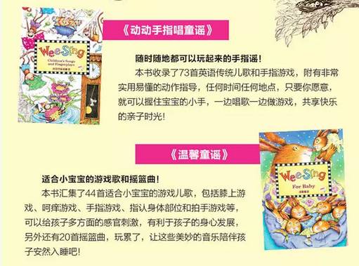 Wee Sing囊括了英文经典儿歌歌曲,内容丰富,分类清晰。音乐动听,层次分明。在美国风行几十年,家喻户晓,路边小店都有售。