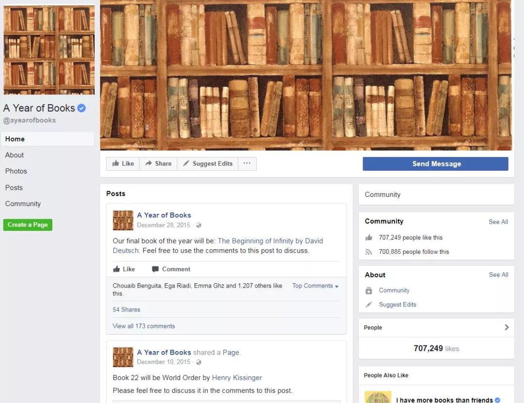 2015年,扎克伯格的挑战是每个月读两本书,重点学习不同的文化、信仰、历史和科技。马克·扎克伯格在Facebook 上说,对比当前的其他媒体,读书能让你更完整地探索一个主题和更深地沉浸在自己的世界里。他在Facebook上开了个A Year of Books(https://www.facebook.com/ayearofbooks/)读书专业,找专人负责发布他正在读的书目,并且还会叫上读过的朋友一起来讨论。