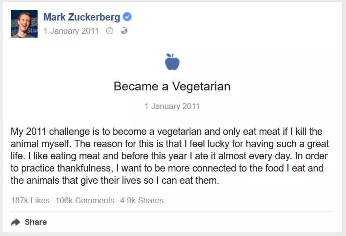 2011年,扎克伯格宣布今年的挑战是只吃自己亲手屠宰的动物,自己今后将不会在外面餐馆吃肉。他认为许多屠宰场使用非人道的方式杀死家畜,而自己动手用人道方式至少可以让家畜减少痛苦。只吃自己亲手屠宰的动物简直相当于素食宣言,所以在这一年里他成为了素食者。
