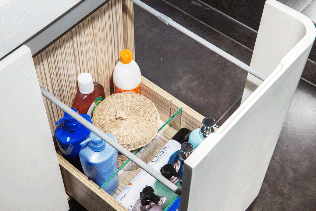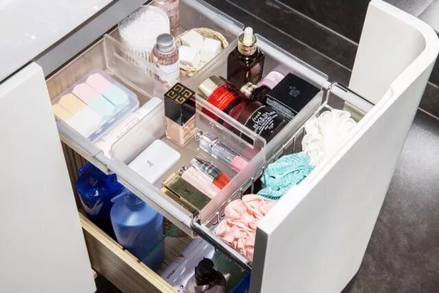 抽屉下层自由分隔区域,可以用玻璃隔出最合适的间隔空间,分门别类存放全家人的洗漱洗涤备用品。这里高度空间较为宽裕,适合存放较高的瓶瓶罐罐。
