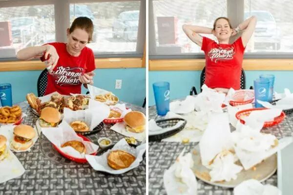我的妈妈很能吃,她每天比我们两个男人加起来都能吃,上顿刚吃完就惦记着吃下顿。哎,你瞧她腰越来越粗,肚子越来越大,怎么一点也不注意身材呢!