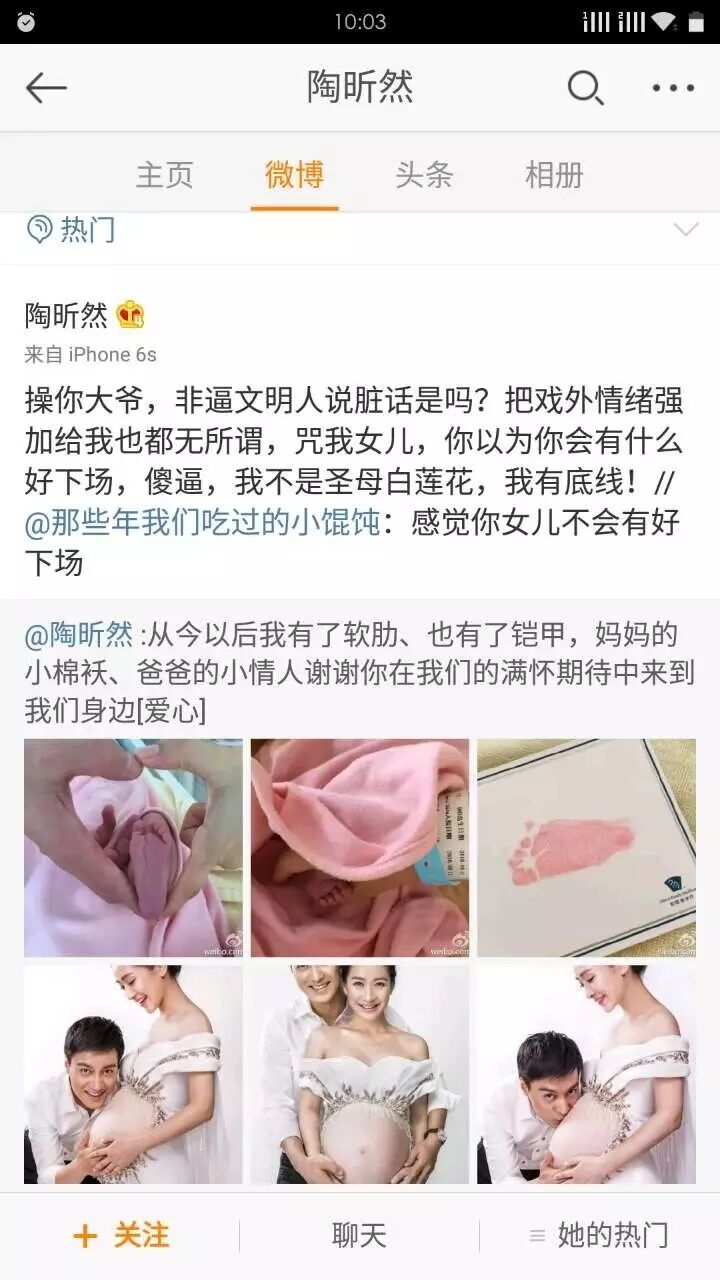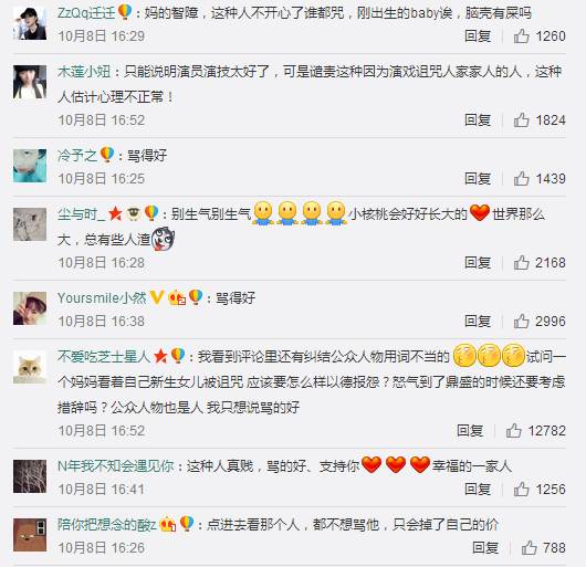 《甄嬛传》里的安陵容扮演者陶昕然最近喜得爱女,然而微博晒宝宝时,竟有网友留言:“感觉你的女儿不会有好下场”,逼得她直接爆粗:“操你大爷”