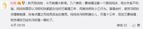 冯轲回应了张靓颖妈妈的质疑,并称会用一生珍惜张靓颖,